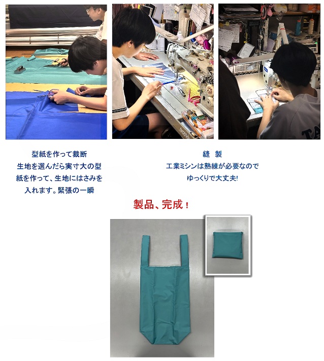 テーマは「おかあさんにありがとうの気持ちを込めて、渡せる製品。」今年はマイバッグを作ることになりました。イメージに合った生地を選ぶ、縫い方を考える、等々。初めてのことばかりで大変そうでしたが、楽しく作業をしていました。